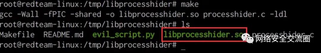 make6、编译将生成一个名为“www.example.com”的共享对象文件libprocesshider.so,如下面的屏幕截图所示。