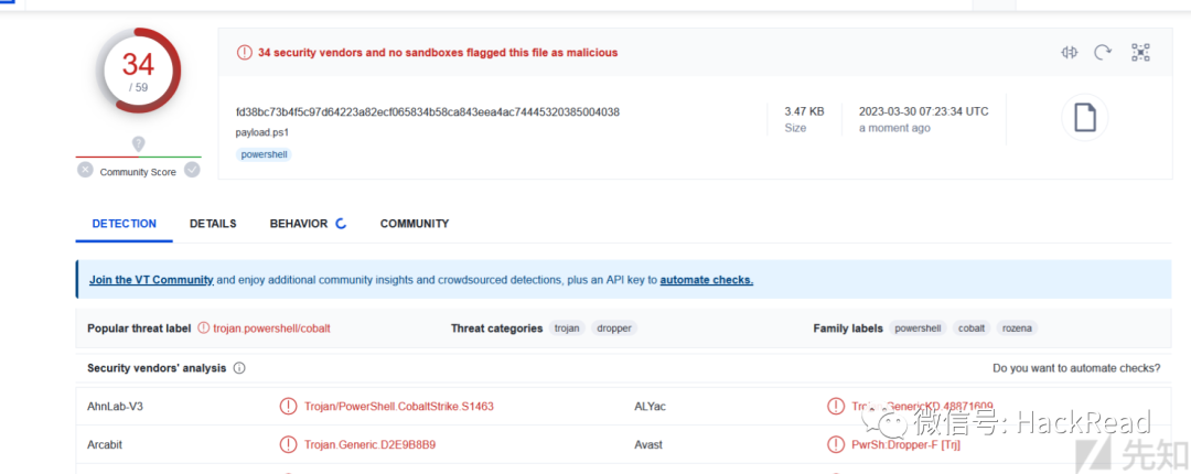 第一步将涉及创建恶意PowerShell脚本并将其保存,沙箱检测如下所示: