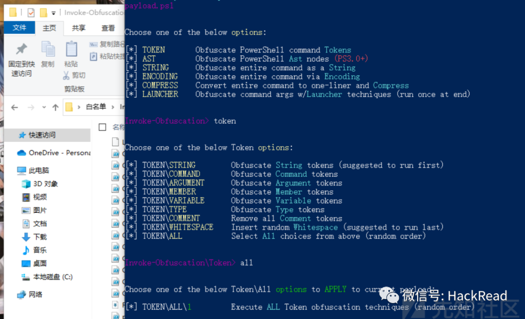 这时,我们可以选择合适混淆方法,通过在Invoke-Obfuscate提示符中运行命令来选择此选项: