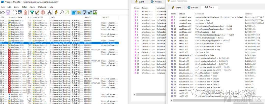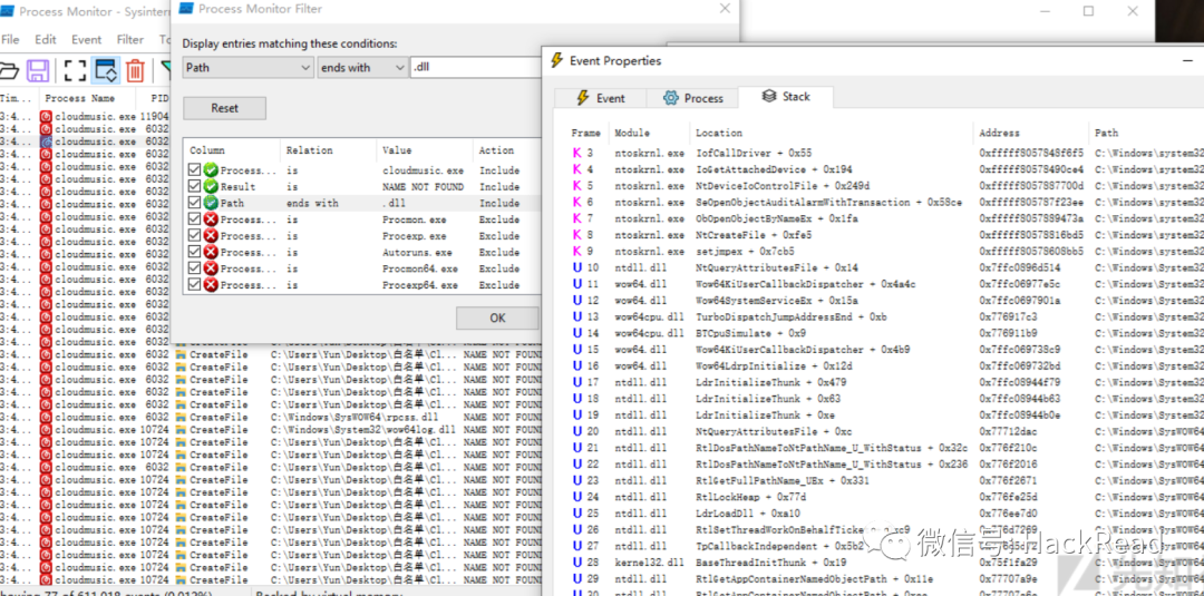 通过Procmon进程监视器,显示实时⽂件系统、注册表和进程/线程活动,这⾥我们⽤来观察进程运⾏过程的DLL调⽤。通过设置不同的筛选方式去寻找可以加载的黑DLL。