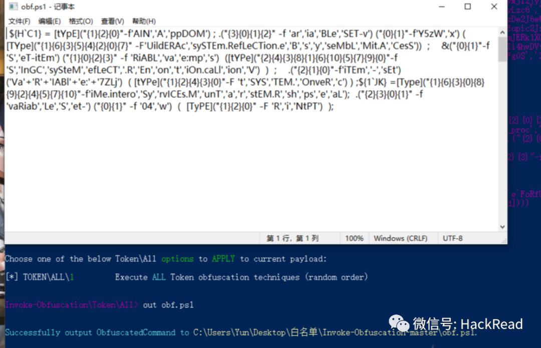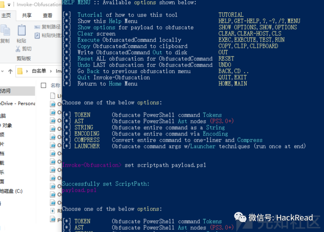 创建并保存恶意PowerShell脚本后,打开混淆工具,我们可以通过在Invoke-Obfuscate提示符中运行以下命令来完成:
