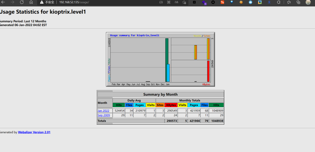 ===============================================================Gobuster v3.1.0by OJ Reeves (@TheColonial) & Christian Mehlmauer (@firefart)===============================================================[+] Url: http://192.168.52.135[+] Method: GET[+] Threads: 10[+] Wordlist: /usr/share/wordlists/dirbuster/directory-list-2.3-medium.txt[+] Negative Status codes: 404[+] User Agent: gobuster/3.1.0[+] Extensions: html,zip,php,txt[+] Timeout: 10s===============================================================2022/01/06 02:34:06 Starting gobuster in directory enumeration mode===============================================================/index.html (Status: 200) [Size: 2890]/test.php (Status: 200) [Size: 27]/manual (Status: 301) [Size: 294] [--> http://127.0.0.1/manual/]/usage (Status: 301) [Size: 293] [--> http://127.0.0.1/usage/]/mrtg (Status: 301) [Size: 292] [--> http://127.0.0.1/mrtg/]===============================================================2022/01/06 02:39:27 Finished===============================================================
