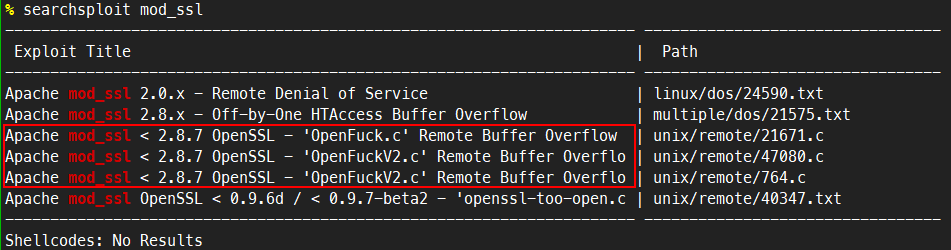尝试搜索利用脚本searchsploit mod_ssl,发现2.8.7版本存在多个远程溢出漏洞,尝试利用