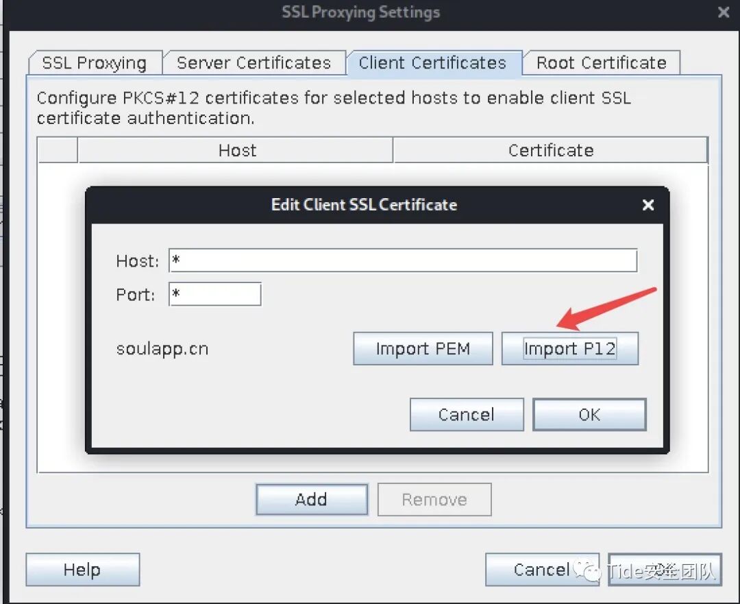 然后进去之后导入p12证书和密码(自吐出的密码),host和port输入*