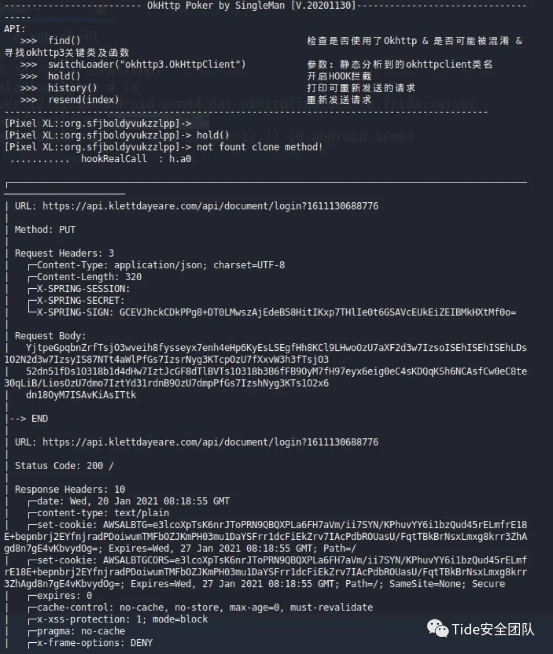 # frida -U -l okhttp_poker.js -f org.sfjboldyvukzzlpp --no-pause然后复制被混淆后的类名,粘贴到okhttp_poker.js文件中,重新运行后运行hold()开启hook拦截,然后操作App后,会出现拦截的内容如下
