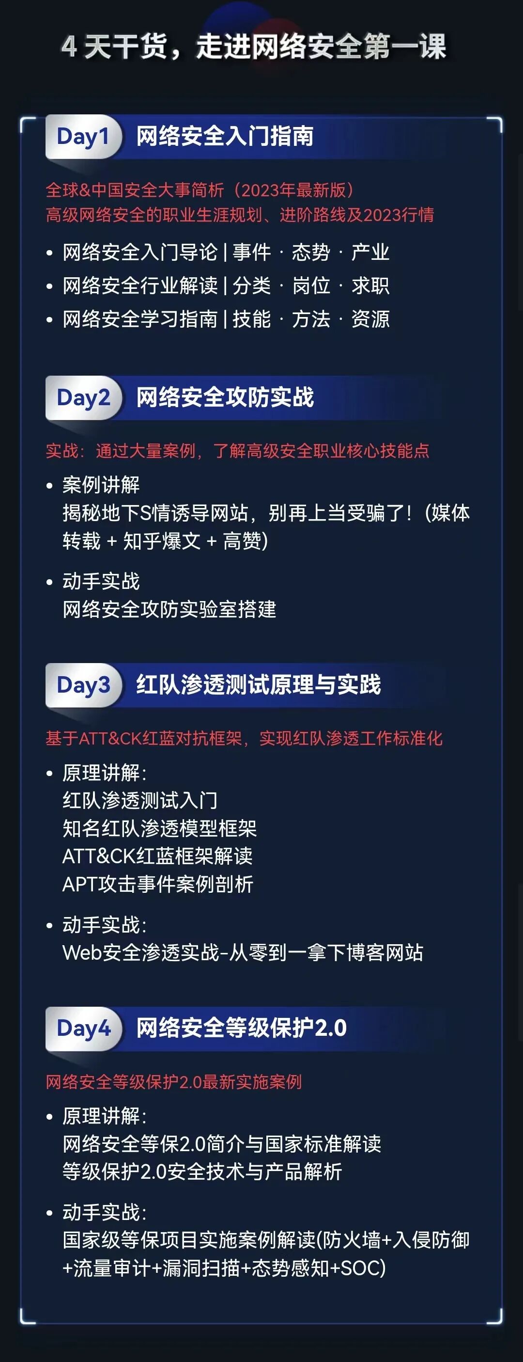 本安全体验营涵盖网络安全入门指南、安全等保2.0、Kali Linux渗透测试、互联网业务安全实战、情报搜集与反诈骗实战等多个热门前沿安全专题。这门课以实战驱动学习,充分调动同学们的兴趣及动手能力,为的是培养实战型的攻防兼备网安人才,帮助你科学体系化地学习前沿安全技能,了解安全行业。![]()
