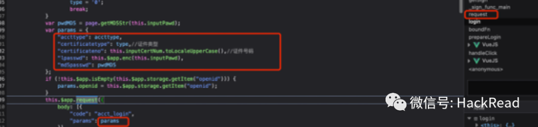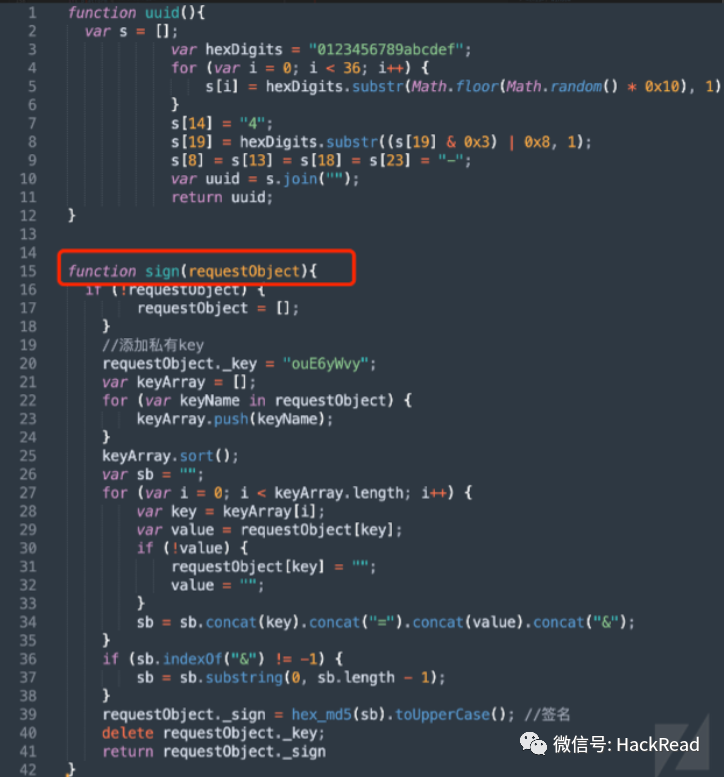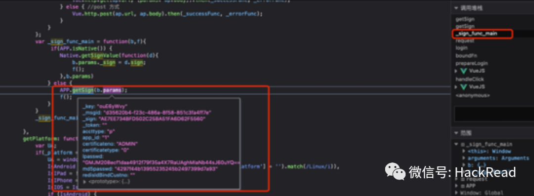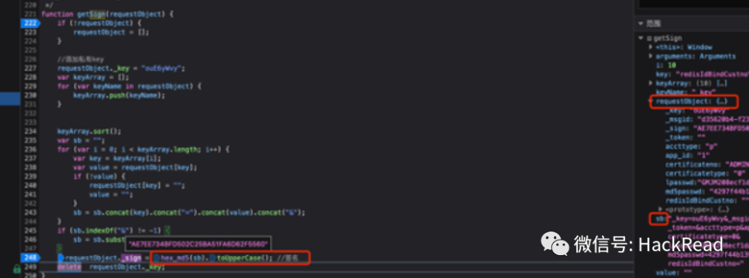 此处对前端代码进行调试,得知传入的参数requestObject为字典格式,通过对字典数据进行处理后得到参数"sb"的值,最终将"sb"的值MD5加密后得到加签字段"_sign"的值