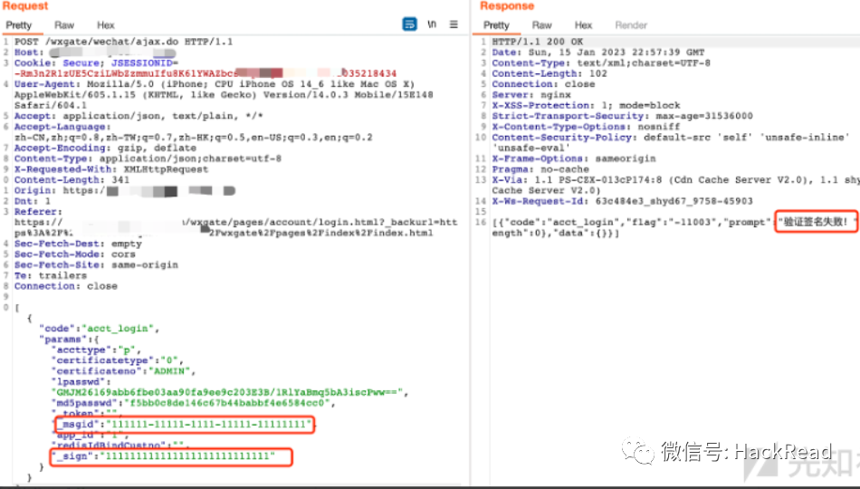 通过测试得知,服务端会对每个请求数据包的"_msgid"和"_sign"参数进行验签,一但数据包被修改或者重复发送相同数据包,服务端则会返回"验证签名失败!"