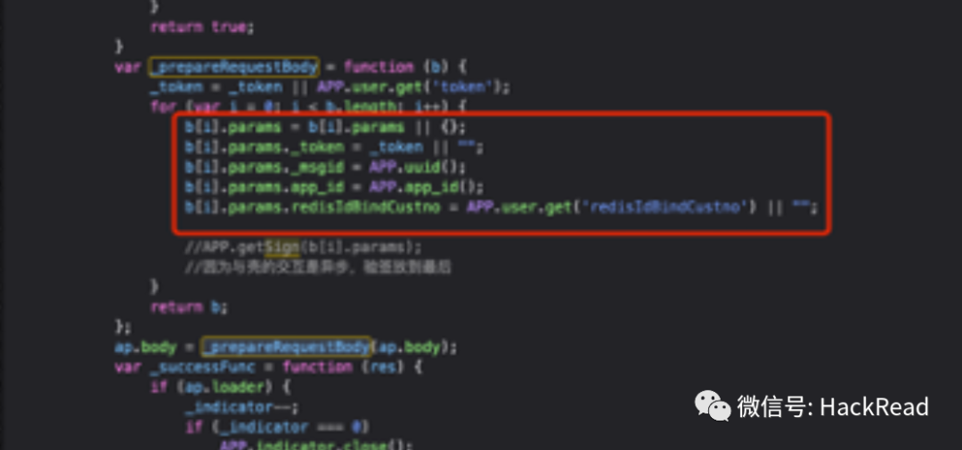 分析后得知"requestObject"由两部分组成,一部分为不固定参数,根据业务功能点不同传入不同的参数字典,另一部分为固定参数token、msgid、app_id、redisIdBindCustno添加到字典数据的尾部,然后传入getSign获取加签参数"_sign"的值