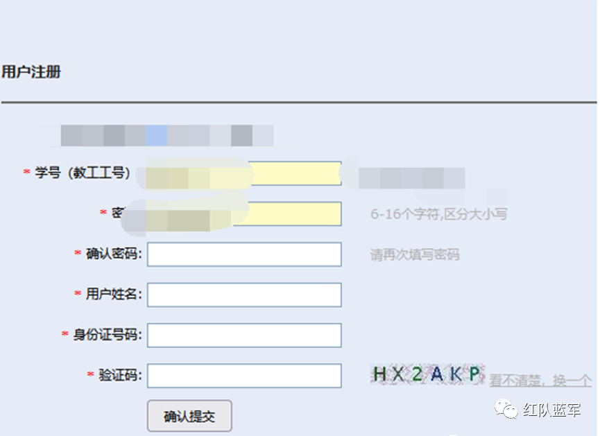 这边的学号啥的我都是不知道的而且这边最后显示的不是注册,显示的是提交所以可以断定注册账号得需要管理员审核信息才能注册,所以我没报啥希望随便编了一个1213311的学号,身份证号码是bing上随便搜的一个身份证。