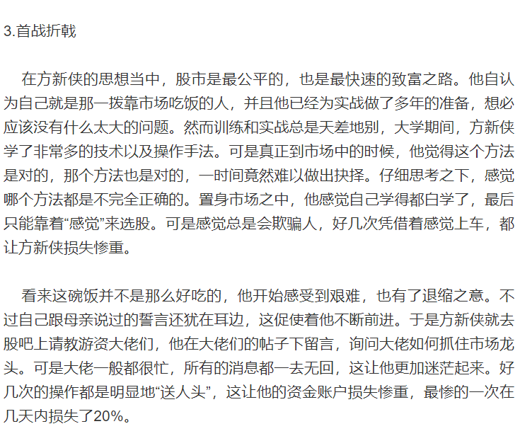 尽管方父方母对儿子要炒股为生的想法不是很支持,但是看着儿子一腔热血,又不好打击他,所以还是为其拿了几万元的起始资金,助力儿子实现梦想。想着方新侠输光这些钱之后,能够认识到股市的残酷,之后可以好好做一些正事。就这样,方新侠带着父母给的几万元钱,踏上了属于他的传奇之路!