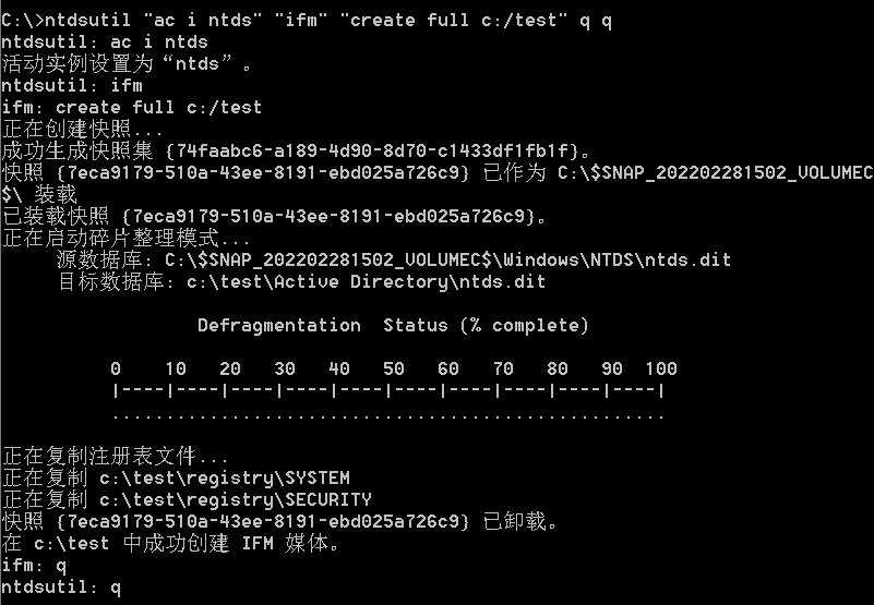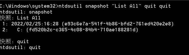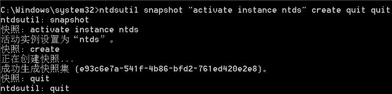 ntdsutil snapshot "activate instance ntds" create quit quit查看快照是否创建成功: