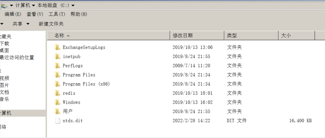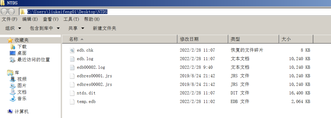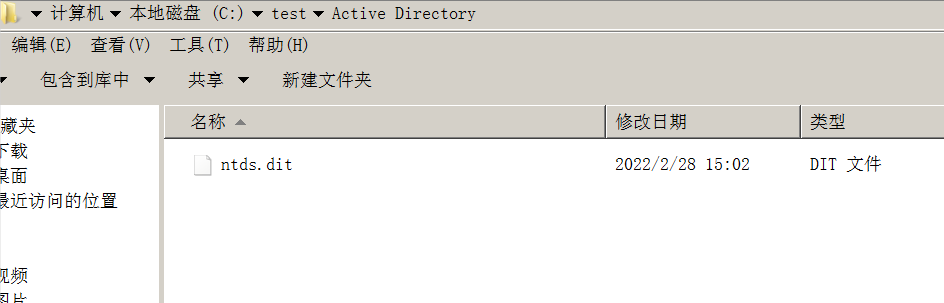 将ntds.dit复制到C盘下的test文件夹中的Active Directory文件夹中: