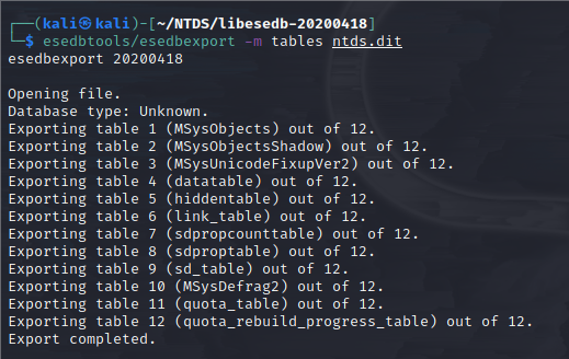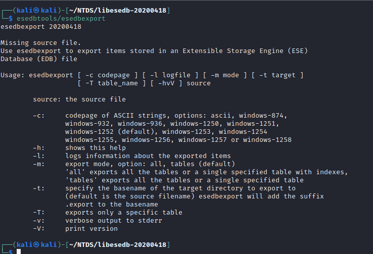 wget https://github.com/libyal/libesedb/releases/download/20200418/libesedb-experimental-20200418.tar.gztar zvxf libesedb-experimental-20200418.tar.gz./configuresudo make && make install && ldconfigsudo ldconfigesedbtools/esedbexport