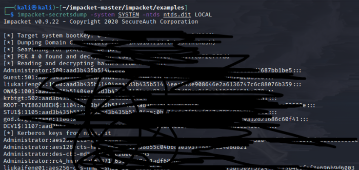 python dsusers.py datatable.3 link_table.5 output --syshive system.hive --passwordhashes --pwdformat ocl --ntoutfile ntout --lmoutfile lmout | tee result.txt使用impacket导出Hash