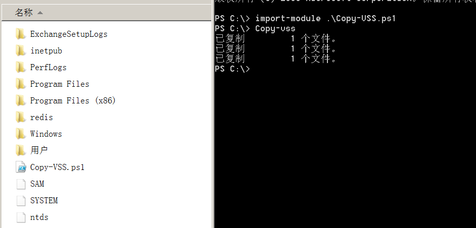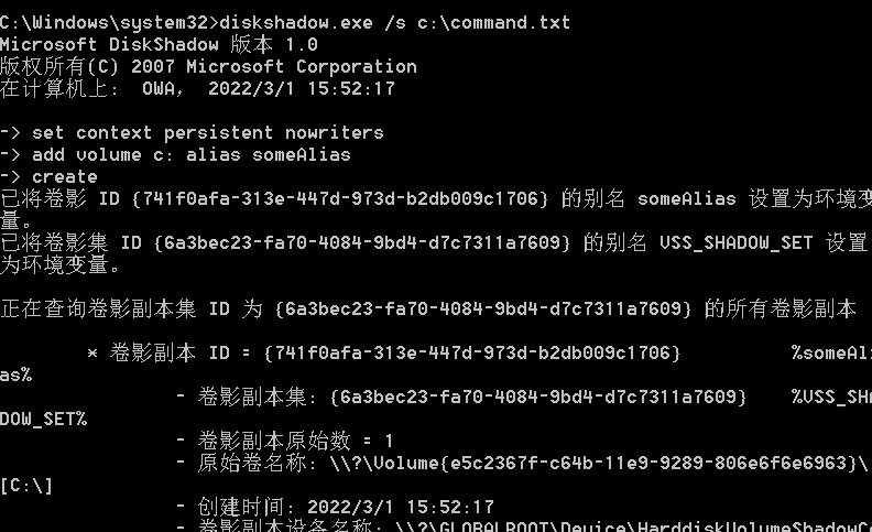 diskshadow.exe /s c:\command.txtdiskshadow提取ntds.dit: