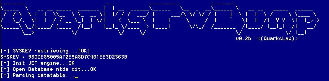 QuarksPwDump.exe -dhd -sf system.hive -nt ntds.dit -o log.txt使用esedbexport恢复ntds.dit
