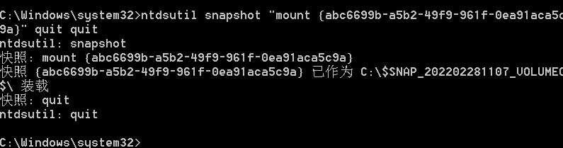 ntdsutil snapshot "List All" quit quit挂载快照:
