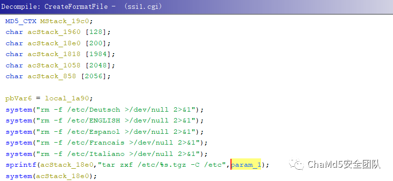 我们继续去看一下CreateFormatFile函数。很明显,这个函数由于传进来的参数param_1没有进过任何检查,存在一个命令注入漏洞。