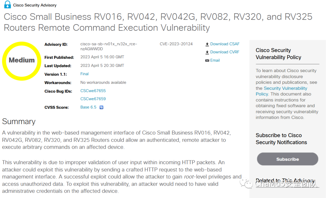 目前该漏洞已经提交给了思科厂商,思科已确认了该漏洞。https://sec.cloudapps.cisco.com/security/center/content/CiscoSecurityAdvisory/cisco-sa-sb-rv01x_rv32x_rce-nzAGWWDD