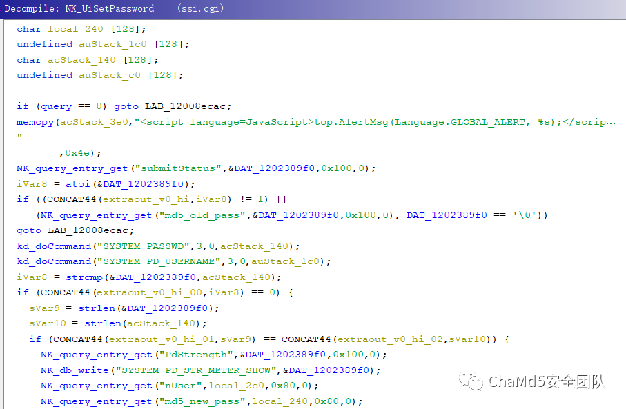 知道这个漏洞的前因后果之后,笔者就在想这个被修复之后的固件当中是否依旧可能存在一些没有过滤或者过滤不完整的地方。就去看了一些感觉可能存在漏洞的函数,后来就找到了NK_UiSetPassword这个函数,这个函数的作用是更改用户的密码。