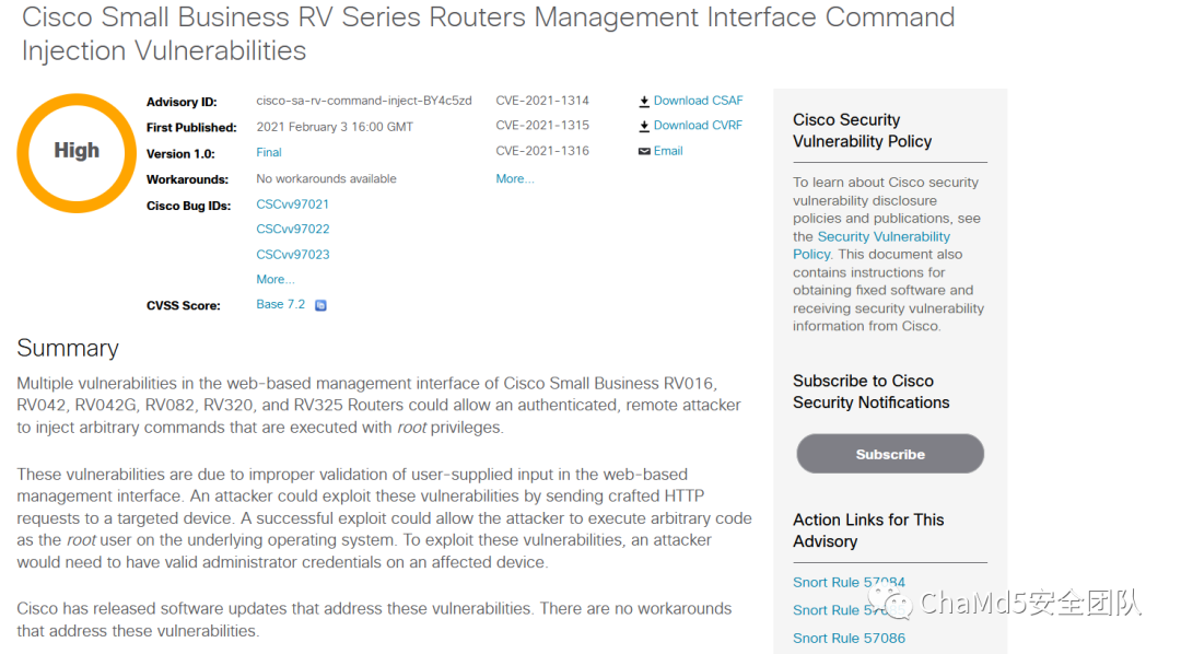 拿到一个iot设备,笔者比较喜欢先去看一下它的历史漏洞,也许可以从中得到一些启发。发现Cisco之前修补过这个系列设备的命令注入漏洞。