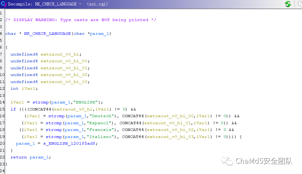 在ssi.cgi这个文件当中,笔者发现修复之后的固件比修复前的固件多出了两个函数,那么大概率就是通过这两个函数对存在命令注入的地方加上了检查以修复命令注入漏洞。直接看一下修复之后的固件里的NK_CHECK_LANGUAGE函数。很明显,这个函数的作用是对参数进行了判断和设置,和我们预想的一致。那么旧版本固件中存在的命令注入漏洞大概率出现在这个函数的上层函数中。