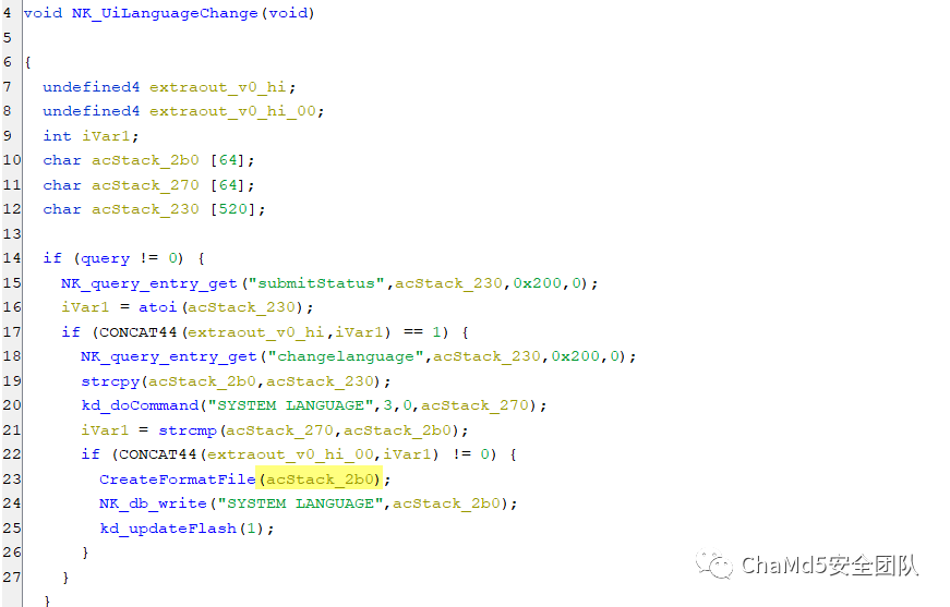 通过交叉引用,我们可以很轻松地找到其上层函数是NK_UiLanguageChange,我们看一下修补前的固件中的这个函数实现了什么功能。通过函数名,大体可以判断出这个函数的作用应该是切换界面的语言。这个函数首先获取了submitStatus和changelanguage的值,经过一些判断后,把changelanguage的值作为参数传进CreateFormatFile函数中。