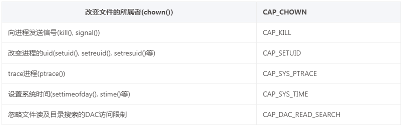 capabilities 把root的权限细分了,可以分别启用或者禁用。在进行特权操作的时候,如果euid不是root,那么系统就会检查是否具有执行特权操作的对应capabilities ,并以此为凭据决定特权操作是否能被执行。如下是一些常见的特权操作及其对应capabilitiesgetcap 用于查询capabilities,setcap用于设置capabilities,capsh用于查当前shell进程的capabilities,filecap既能设置又能查询。我们可以通过以下指令搜索设置了capabilities的可执行文件2. 实操