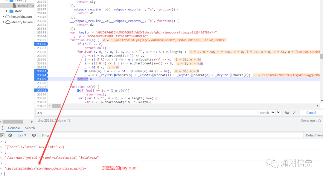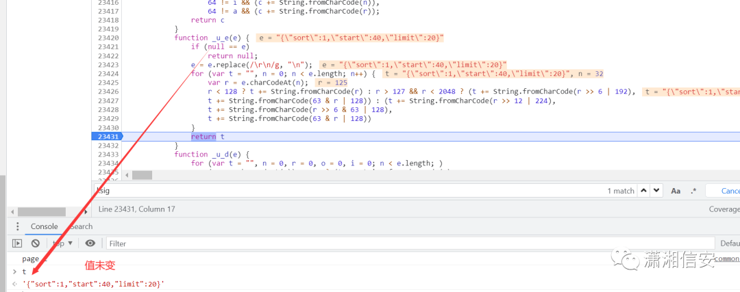 第1次进入e2(e) ,进去前e还是明文的payload,进去了_u_e(e) 返回t '{"sort":1,"start":40,"limit":20}' 值没变。