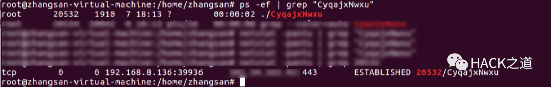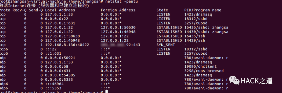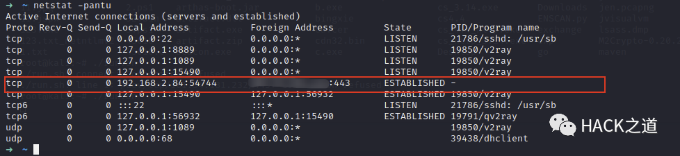 查看网络连接状态,可以看到我们反弹shell的外连IP看不到对应的进程