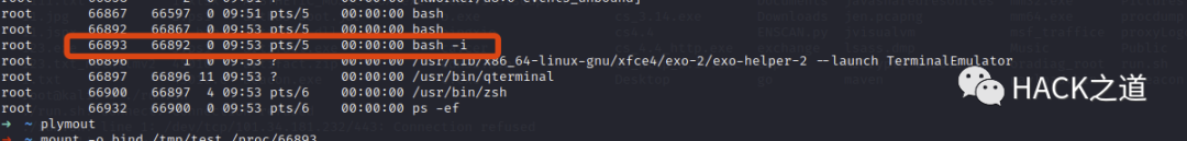 mount -o bind /tmp/test /proc/66893 (这里的进程ID就是上面执行反弹shell的对应ID)