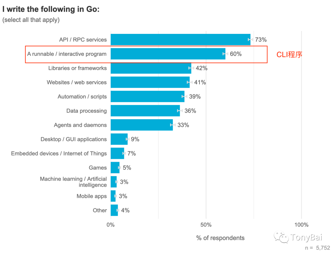 2022年Q2 Go官方用户调查结果[4]显示(如下图):在使用Go开发的程序类别上,CLI类程序排行第二,得票率60%。