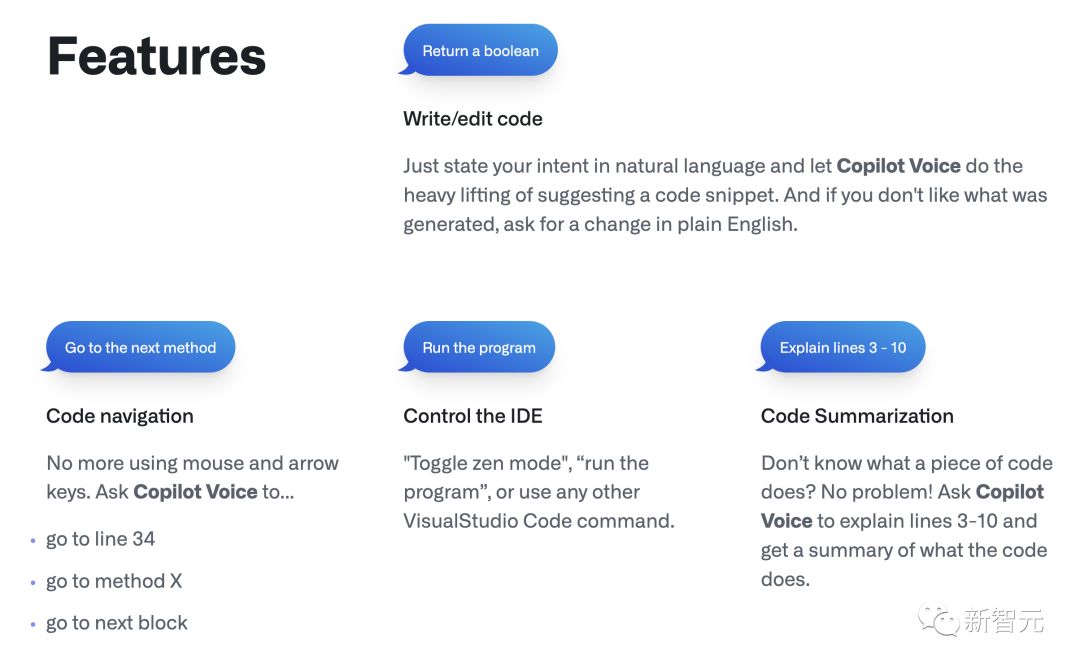 申请地址:https://github.com/github-copilot/chat_waitlist_signup/joinGitHub在Copilot中内嵌一个基于GPT-4的聊天窗口,专注于开发者场景,并集成成在VS Code和Visual Studio上。现在,Copilot不仅可以识别开发者输入的代码内容,报错信息显示,还可以对代码块的用途进行深入分析和解释,生成单元测试。此外,在Copilot中,你甚至不再需要键盘来编写代码。只需坐在电脑前,说一句「嘿,GitHub!」,动动嘴皮子编代码就能实现了。目前,GitHub正在试验GitHub Copilot Voice新功能,一个基于语音的交互系统。除了编写代码,通过Copilot Voice,你甚至可以完成:代码跳转、控制IDE、代码总结。Copilot for Pull Request