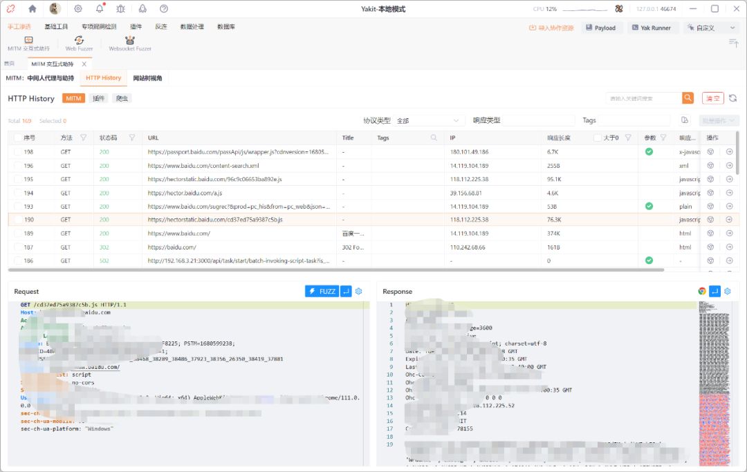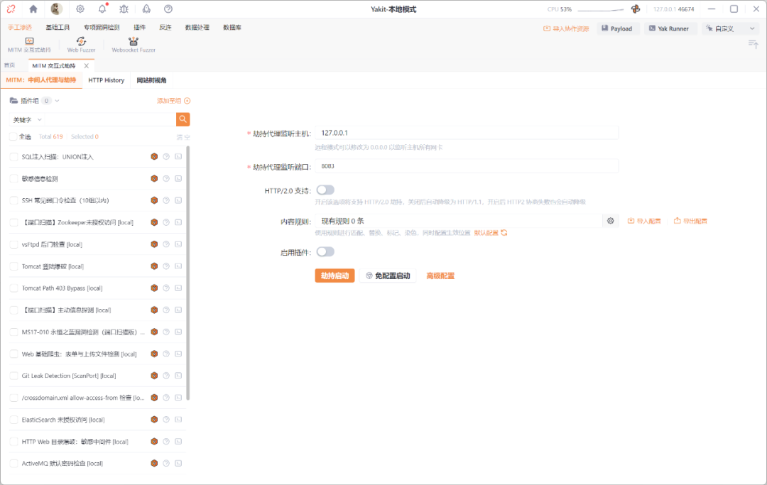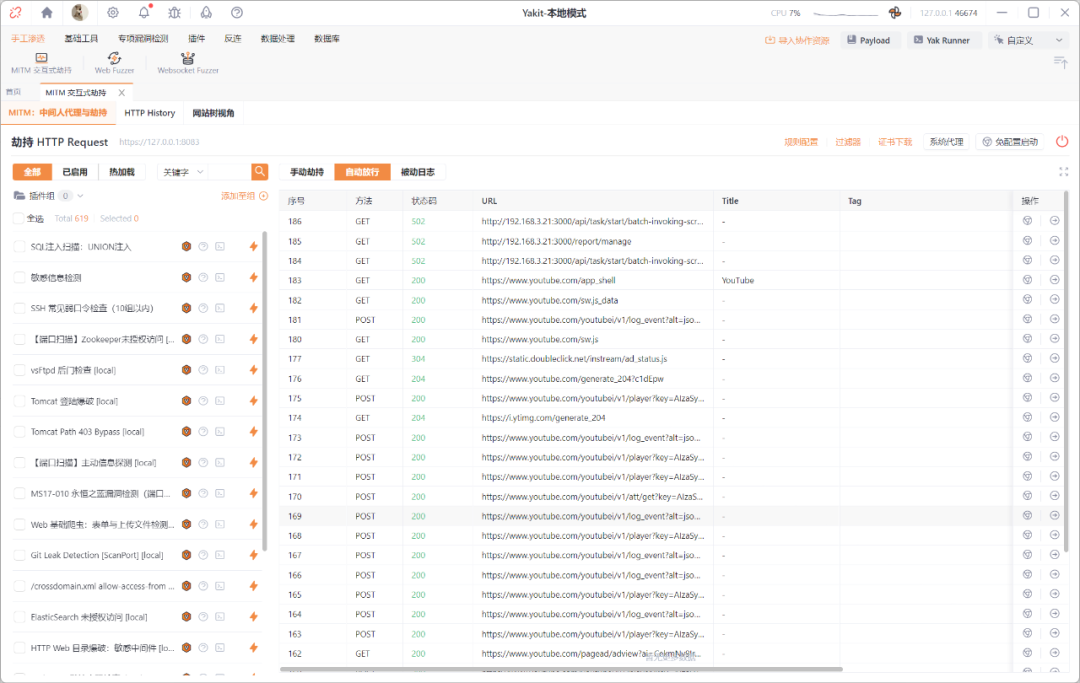 插件联动:在劫持过程中,也可启用插件进行被动扫描,包括漏洞检测、指纹发现等
