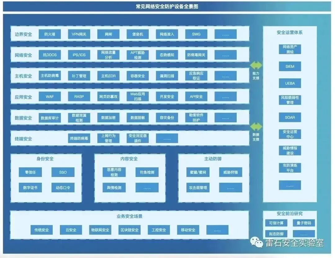最基础的网络安全建设是网络安全防护设备的补充,通过如下这张图可以清晰直观地了解不同类型的网络安全防护设备的防护侧重点,其中很多基础安全设备的作用及原理大家已经了然于心,在此也就不多加赘述,大家可以以此为参考,自行思考企业安全防护能力薄弱点。(图片仅代表个人对于常见网络安全设备类型的理解,非官方定义)