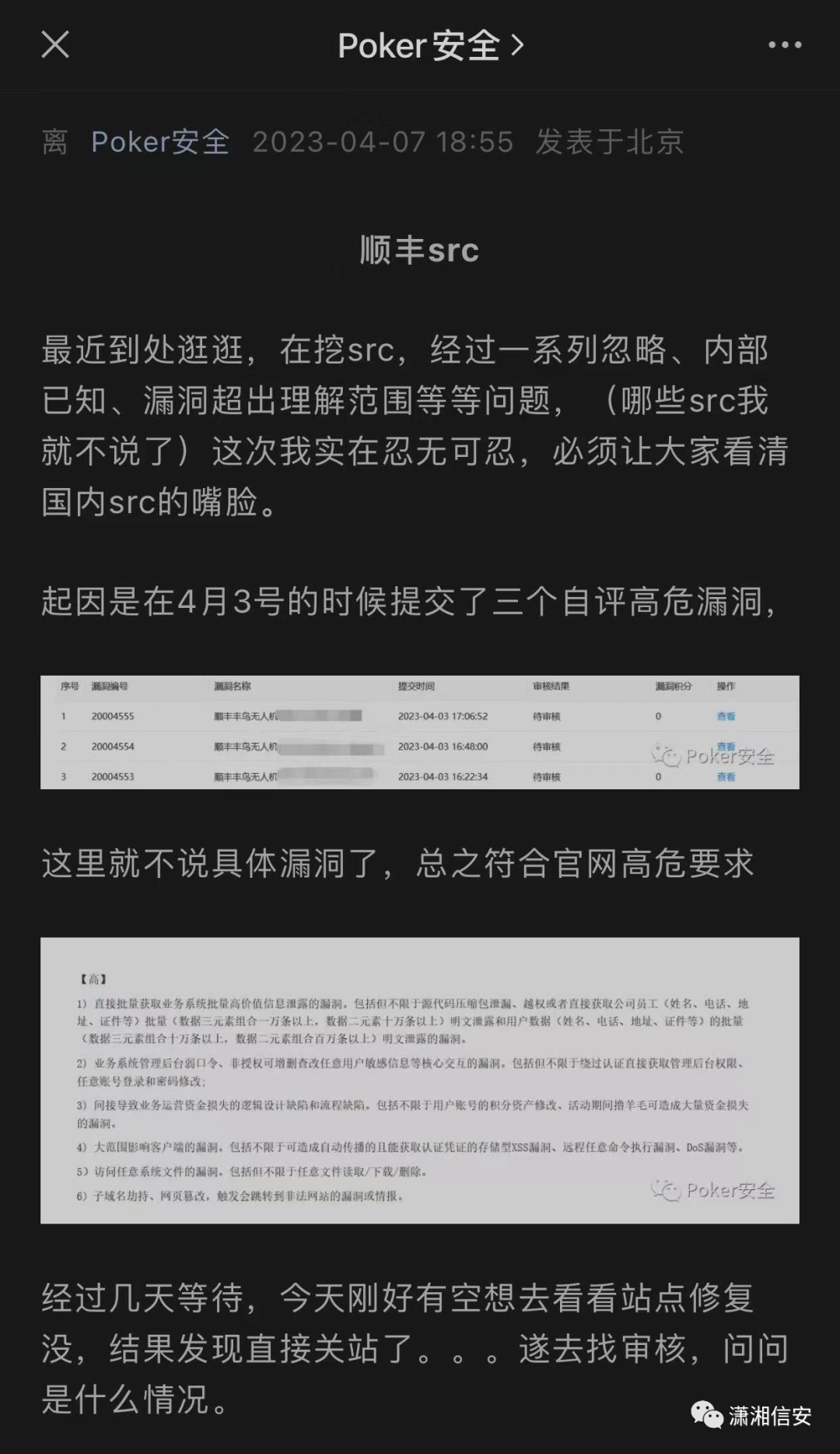 朋友圈疯传的一篇文章,Poker安全@离师傅发文吐槽某丰SRC审核问题,还有其他SRC没有点名,大家可以去看下原文:重生之我在某丰src当讨口子