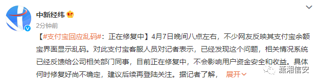 4月7日晚8点左右支付宝APP的余额宝、工资理财等多个页面出现乱码,原因不明,官方很快就做了紧急处理。长图,上下划查看更多!