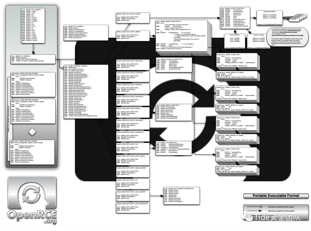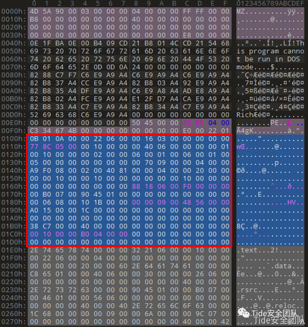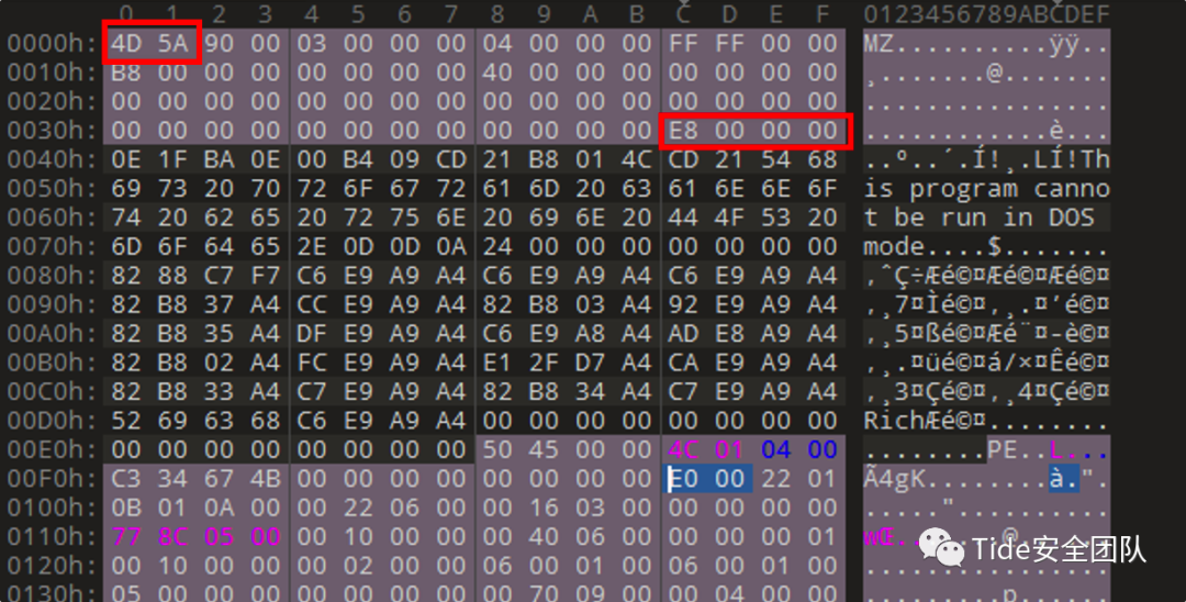 struct _IMAGE_DOS_HEADER {0x00 WORD e_magic; * //5A 4D MZ标记,用来判断是否为可执行文件0x02 WORD e_cblp; //00 900x04 WORD e_cp; //00 030x06 WORD e_crlc; //00 000x08 WORD e_cparhdr; //00 040x0a WORD e_minalloc; //00 000x0c WORD e_maxalloc; //FF FF0x0e WORD e_ss; //00 000x10 WORD e_sp; //00 B80x12 WORD e_csum; //00 000x14 WORD e_ip; //00 000x16 WORD e_cs; //00 000x18 WORD e_lfarlc; //00 400x1a WORD e_ovno; //00 000x1c WORD e_res[4]; //00 00 00 000x24 WORD e_oemid; //00 000x26 WORD e_oeminfo; //00 000x28 WORD e_res2[10]; //00 00 00 00 00 00 00 00 00 00 00 00 00 00 00 00 00 00 00 000x3c DWORD e_lfanew; * //00 00 00 E8 PE头相对于文件的偏移,用于定位PE文件};