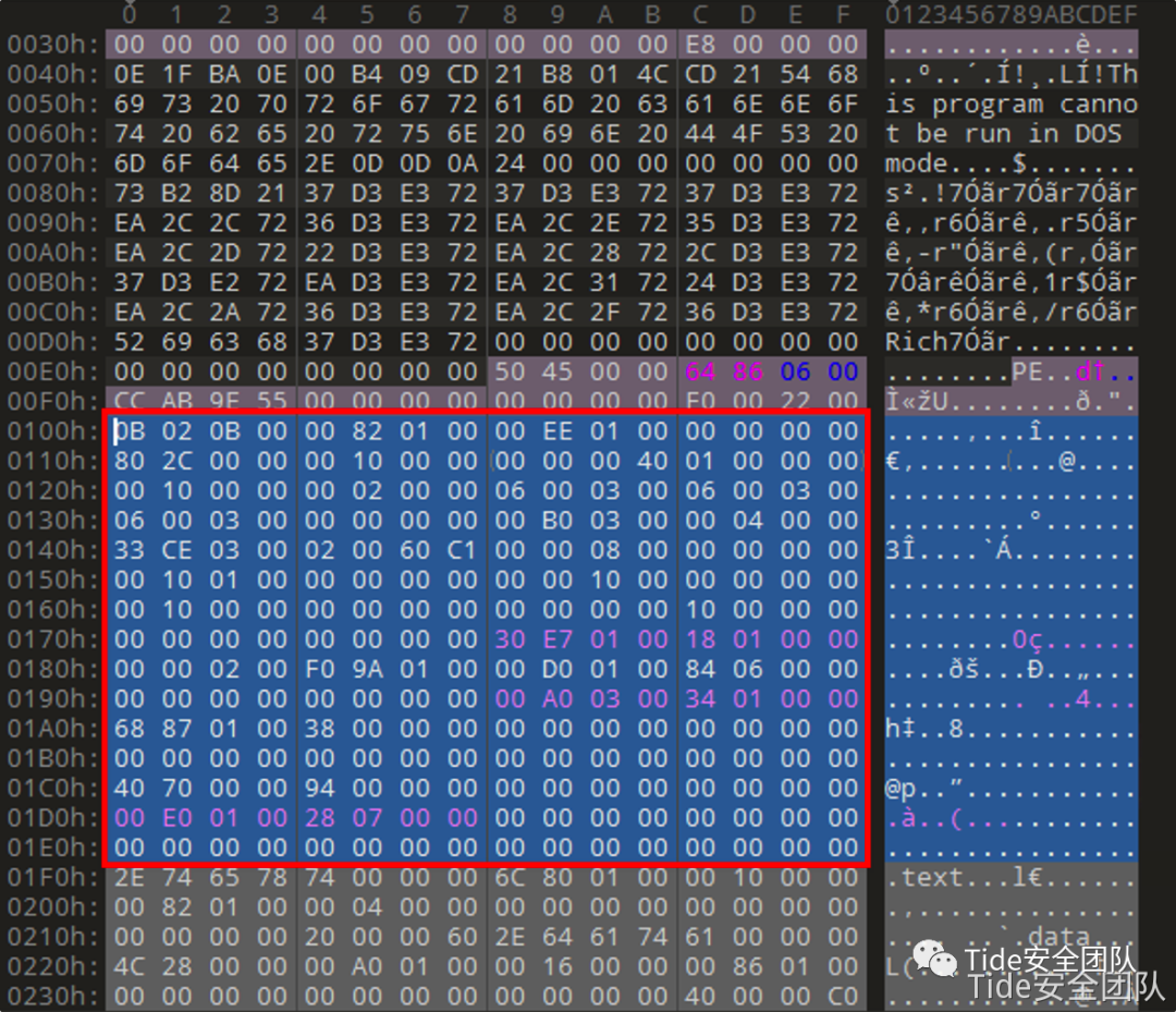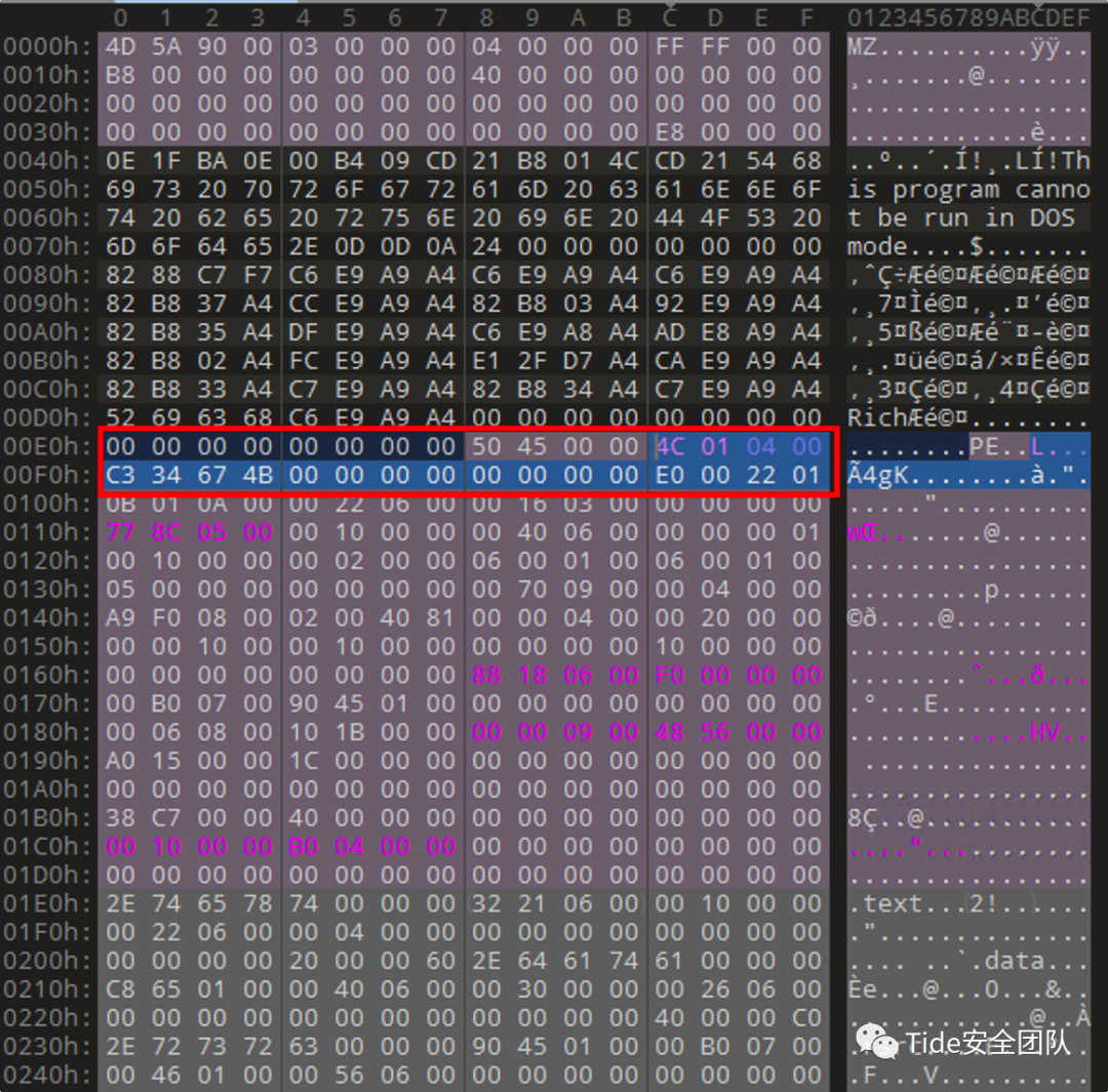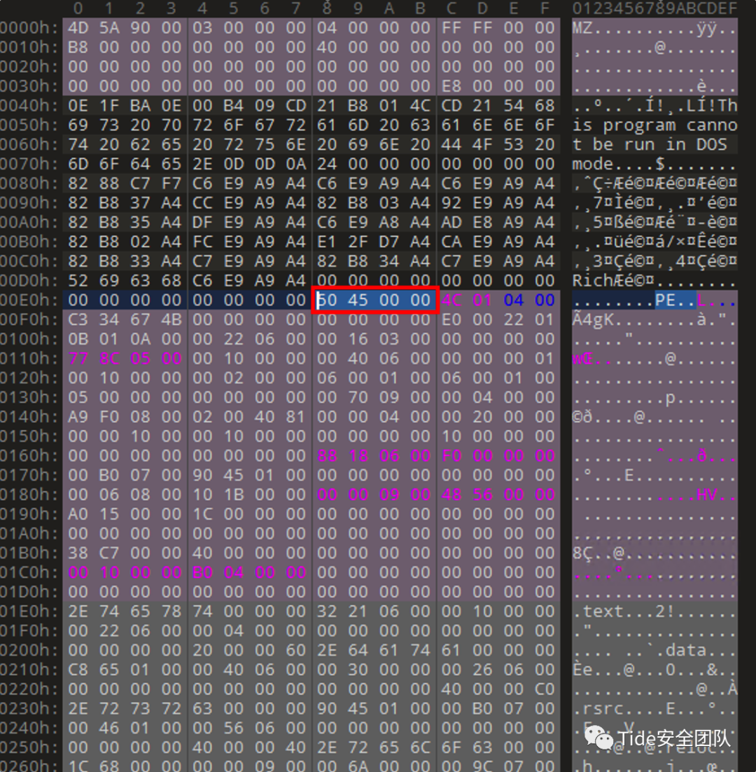 e_magic:在DOS头开始的位置,大小为2字节,存储的内容一般为5A 4D,也就是'MZ'的十六进制,'MZ'是MS-DOS的创建者之一Mark Zbikowski名字的缩写,通常用来判断文件是否为可执行文件。e_lfanew:在DOS头结束的位置,大小为4字节,是PE头相对于文件的偏移,用于定位PE文件头的位置。e_lfanew中存储的数据找到PE文件头的位置,图中e_lfanew存储的内容为00 00 00 F0(小端存储),所以可以定位到PE文件头的位置在F0H。e_lfanew到PE文件头的这段空间,是由编译器生成,用来存储一些程序运行的信息,可以随意更改,对程序没有影响。struct _IMAGE_NT_HEADERS {0x00 DWORD Signature; //00 00 45 50 PE文件标识,PE文件头的开始0x04 _IMAGE_FILE_HEADER FileHeader; //标准PE头0x18 _IMAGE_OPTIONAL_HEADER OptionalHeader; //可选PE头};