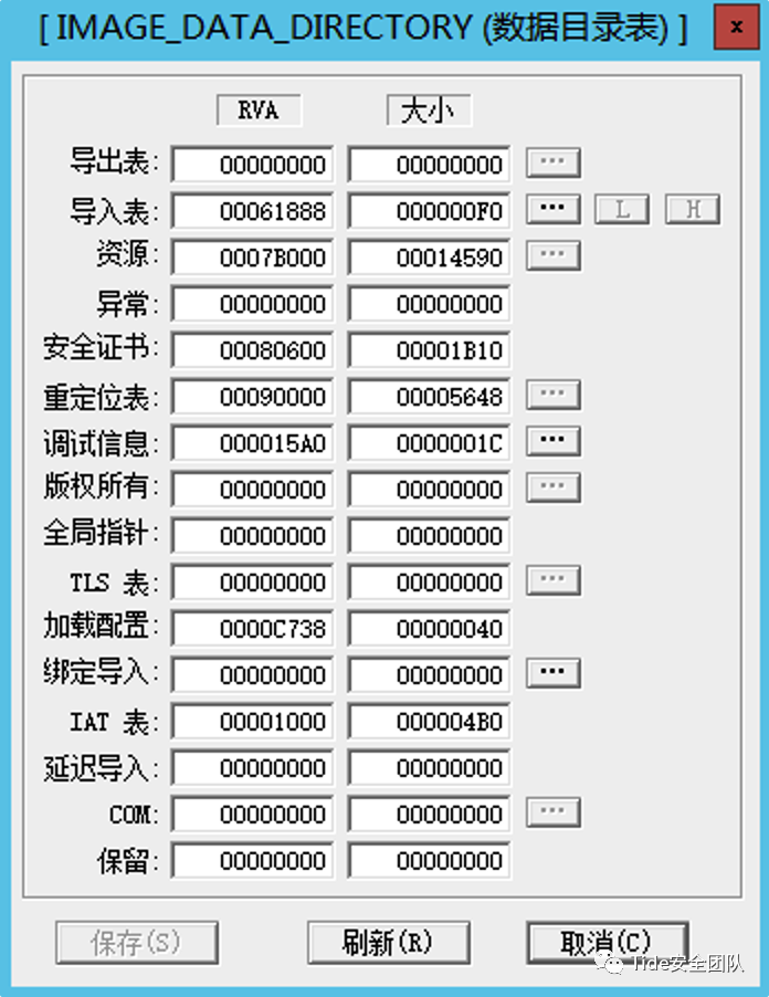 Magic:说明文件是ROM镜像(0107h),还是普通的可执行的镜像(010Bh),一般来说32位程序是010Bh,64位程序是020Bh。SizeOfCode:存储了所有代码节的和,他必须是FileAlignment文件对齐的整数倍,此程序文件对齐的大小是200H,所以SizeOfCode的大小为1000H,为200H的整数倍,由编译器填写。SizeOfInitializedData:存储已经初始化数据块的大小,即在编译的时候所构成的块的大小(不包括代码段),此值也为文件对齐的整数倍,由编译器填写。SizeOfUninitializedData:未初始化数据块的大小,装载程序要在虚拟地址空间中为这些数据约定空间,一般存在.bss节中,为文件对齐的整数倍,由编译器填写。AddressOfEntryPoint:可选PE头中最重要的一个参数,也就是我们通常说的OEP,是当前程序的入口位置,该地址是一个相对虚拟地址,指向了程序执行的第一条代码,如果程序被加壳,那么这个地址就会被修改,通常在使用OD进行动态调试的时候,OD首次停留的位置就是AddressOfEntryPoint。BaseOfCode:代码开始的基址,在内存中,代码段通常在PE文件头之后,数据段开始之前,此值通常由编译器填写。BaseOfData:数据开始的基址,数据段通常在内存的末尾,在64位程序中没有该参数,此值通常由编译器编写。ImageBase:内存的镜像地址,也称基地址,是文件在内存中的首选装入地址,如果文件需要在内存中执行的话,会首先使用ImageBase中存放的地址,如果地址被占用,文件会被装入到其他地址中,因为直接装入这个地址不需要进行重定位,所以速度会很快,如果当前地址被占用就需要重定位后装入其他的地址,相对来说速度就会慢一些。SectionAlignment:程序被装入内存后的对齐大小,通常为1000H。FileAlignment:程序在没有被装入内存前文件对齐的大小,通常为200H或者1000H,在为1000H的时候文件对齐和内存对齐相同,会加快程序的运行速度。为200H时程序装载到内存中需要进行拉伸操作,把对齐大小拉伸到1000H,这样做相对来说速度会慢一些,但是在磁盘中存储会节省空间。SizeOfImage:是程序在装入内存后的整个PE文件在内存中的映射尺寸,指的就是装入文件从ImageBase到最后一个块的大小,可以比实际的值大,但必须是SectionAlignment内存对齐的整数倍。SizeOfHeaders:是DOS头,PE文件头和节表的总大小,该值必须是正确的,否则程序无法运行。CheckSum:映像的校验和,可以用来检查文件是否被更改。SizeOfStackReserve:初始化时保留的堆栈大小。SizeOfStackCommit:初始化时实际提交的大小。SizeOfHeapReserve:初始化时保留的堆的大小。SizeOfHeapCommit:初始化时实际提交的大小。NumberOfRvaAndSizes:数据目录的项数。DataDirectory:数据目录表,由数个IMAGE_DATA_DIRECTORY结构组成,指向输出表、输入表、资源块等数据,如下图所示typedef struct _IMAGE_SECTION_HEADER {0x00 BYTE Name[IMAGE_SIZEOF_SHORT_NAME]; //00 00 00 74 78 65 74 2E 8字节,节表的名字,一般情况下"\0"来结束,内容可以自己定义union {0x08 DWORD PhysicalAddress;0x08 DWORD VirtualSize;} Misc; //00 01 80 6C 双字,是该节在没有对齐前的真是尺寸,内容可以不准确0x0c DWORD VirtualAddress; //00 00 10 00 节区在内存中的偏移地址0x10 DWORD SizeOfRawData; //00 01 82 00 节在文件中对齐后的尺寸0x14 DWORD PointerToRawData; //00 00 04 00 节区在文件中的偏移0x18 DWORD PointerToRelocations; //00 00 00 00 在exe文件中无意义0x1c DWORD PointerToLinenumbers; //00 00 00 00 在exe文件中无意义0x20 WORD NumberOfRelocations; //00 00 在exe文件中无意义0x22 WORD NumberOfLinenumbers; //00 00 该节在行号表中的行号数0x24 DWORD Characteristics; //60 00 00 20 节的属性};