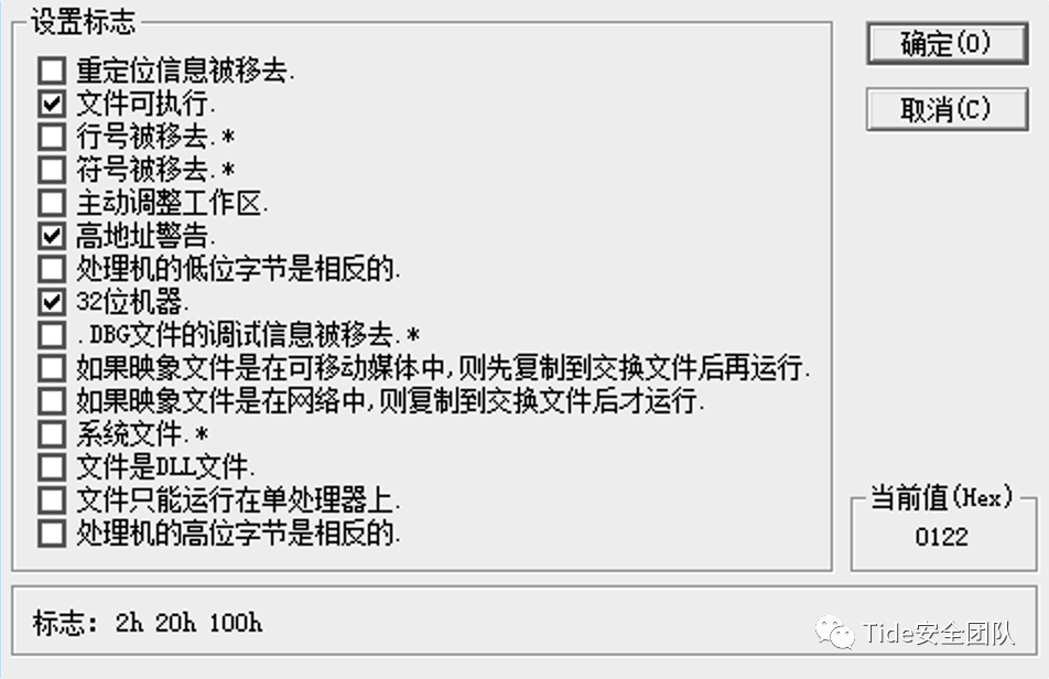 NumberOfSections:存储了文件中节的总数,2字节大小,不同的可执行文件节的总数是不一样的,可以通过NumberOfSections得知当前文件节的总数,对节的内容进行遍历,如果要增加或者删除节,也是修改此参数。TimeDateStamp:存储了文件创建的时间,4字节大小,是由编译器写入的。SizeOfOptionalHeader:存储了可选PE头的大小,2字节大小,可选PE头的大小一般是不固定的,通常情况下32位程序为0xE0,64位程序为0xF0,此值可以自定义。Characteristics:存放了文件属性,2字节大小,它的每一位的含义都不同,当前程序的值为0x0122,所以换算成二进制就是0000 0001 0010 0010,对应的属性如下图所示struct _IMAGE_OPTIONAL_HEADER32 {0x00 WORD Magic; * //01 0B 说明文件是ROM镜像(0107h),还是普通的可执行的镜像(010Bh)0x02 BYTE MajorLinkerVersion; //0A 链接程序的主版本号0x03 BYTE MinorLinkerVersion; //00 链接程序的次版本号0x04 DWORD SizeOfCode; * //00 06 22 00 所有代码节的和,必须为FileAlignment的整数倍,编译器填写0x08 DWORD SizeOfInitializedData; * //00 03 16 00 已初始化数据大小的和,必须为FileAlignment的整数倍0x0c DWORD SizeOfUninitializedData; * //00 00 00 00 未初始化数据大小的和,必须为FileAlignment的整数倍0x10 DWORD AddressOfEntryPoint; * //00 05 8C 77 程序入口0x14 DWORD BaseOfCode; * //00 00 10 00 代码开始的基址,编译器填写0x18 DWORD BaseOfData; * //00 06 40 00 数据开始的基址,编译器填写0x1c DWORD ImageBase; * //01 00 00 00 内存镜像基址0x20 DWORD SectionAlignment; * //00 00 10 00 内存对齐0x24 DWORD FileAlignment; * //00 00 02 00 文件对齐0x28 WORD MajorOperatingSystemVersion; //00 06 要求操作系统的最低版本号的主版本号0x2a WORD MinorOperatingSystemVersion; //00 01 要求操作系统的最低版本号的次版本号0x2c WORD MajorImageVersion; //00 06 该可执行文件的主版本号0x2e WORD MinorImageVersion; //00 01 该可执行文件的次版本号0x30 WORD MajorSubsystemVersion; //00 05 要求最低子系统版本的主版本号0x32 WORD MinorSubsystemVersion; //00 00 要求最低子系统版本的次版本号0x34 DWORD Win32VersionValue; //00 00 00 00 从来不用的字段,通常设置为00x38 DWORD SizeOfImage; * //00 09 70 00 内存中整个PE文件的映射的尺寸0x3c DWORD SizeOfHeaders; * //00 00 04 00 所有头+节表按照文件对齐后的大小,必须是正确的,否则加载会出错0x40 DWORD CheckSum; * //00 08 F0 A9 校验和,用来判断文件是否被修改0x44 WORD Subsystem; //00 02 表明可执行文件所期望的子系统的枚举值0x46 WORD DllCharacteristics; //81 40 DllMain()函数何时被调用,默认为00x48 DWORD SizeOfStackReserve; * //00 04 00 00 初始化时保留的堆栈大小0x4c DWORD SizeOfStackCommit; * //00 00 20 00 初始化时实际提交的大小0x50 DWORD SizeOfHeapReserve; * //00 10 00 00 初始化时保留的堆的大小0x54 DWORD SizeOfHeapCommit; * //00 00 10 00 初始化时实际提交的大小0x58 DWORD LoaderFlags; //00 00 00 00 与调试有关,默认为00x5c DWORD NumberOfRvaAndSizes; * //00 00 00 10 目录项数目0x60 _IMAGE_DATA_DIRECTORY DataDirectory[16];};